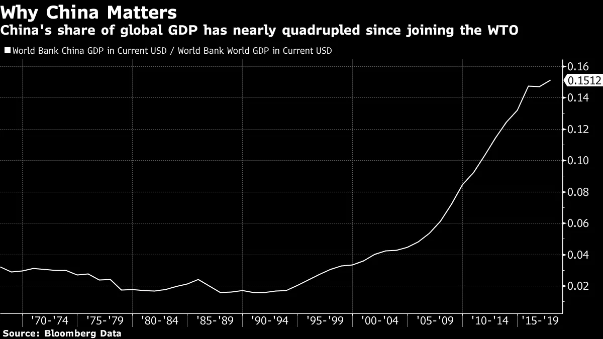 而且这也更为重要。在周一通讯的评论线程中进行讨论后,我查找了中国在全球GDP中的份额。在2001年加入世界贸易组织之前的八年里,这一份额翻了一番。此后几乎翻了四倍。这意味着巨大的经济实力。中国与世界其他地区的贸易条款至关重要: