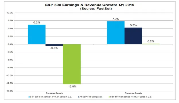 对于跨国公司,正如FactSet的图表所示,收益比一年前下降了12%,而销售额仅增长了0.2%。在这两个方面,这些数字远低于以国内市场为主的公司: