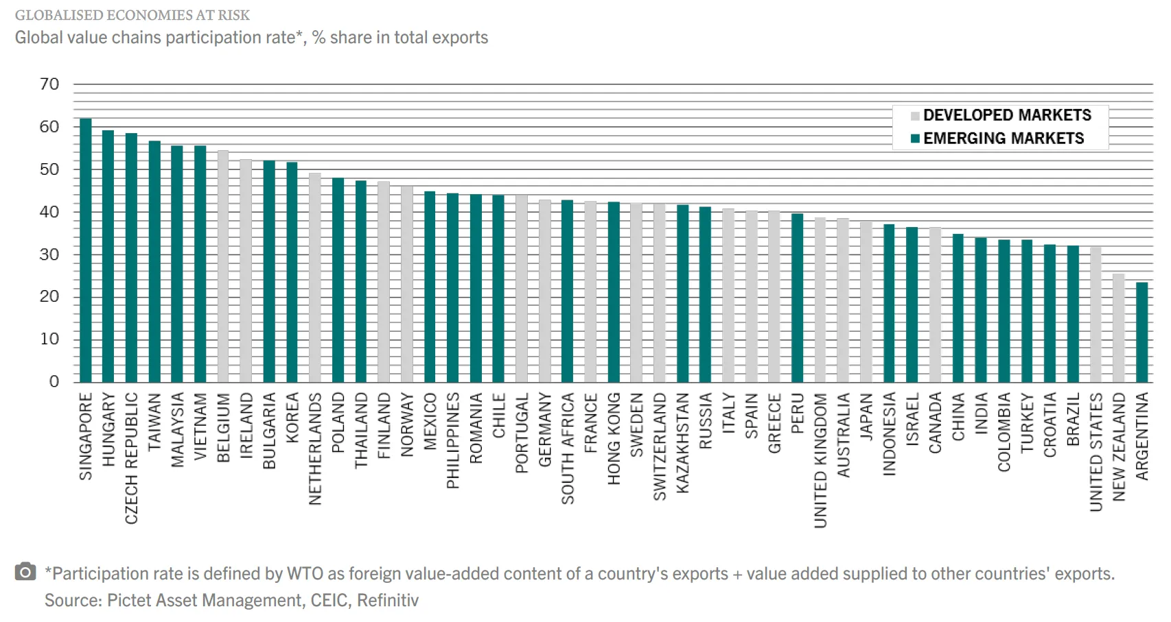 这张由Pictet资产管理公司的Luca Paolini编制的迷人图表有一些惊喜。新加坡,这个终极贸易国家,看起来最为脆弱,其次是一些东欧的前共产主义国家,这些国家已发展成为欧盟工业强国的供应商,还有像台湾、马来西亚和越南这样的“虎”经济体,它们依赖于中国的光环。阿根廷和新西兰,地理上相对偏远,毫不意外地在更高贸易壁垒的世界中相对安然无恙。更有趣的是,美国在全球供应链中的参与程度最低,而一些最大的新兴市场也相对较少地融入世界: