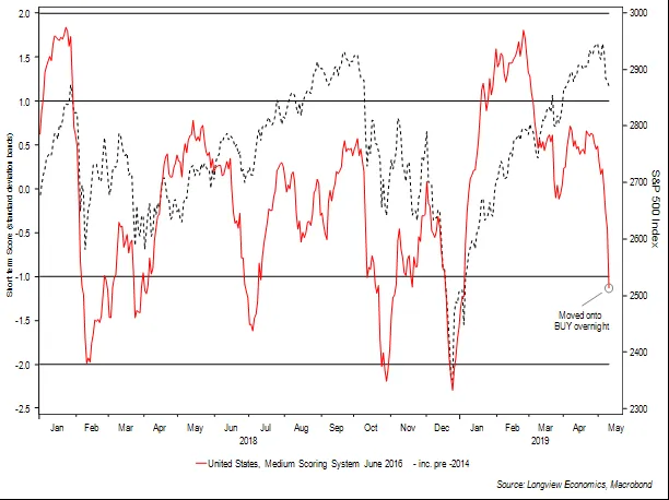[T]本周的价格走势和与贸易战相关的全球风险资产的疲软使我们的多个中期市场时机模型重新回到买入状态。这些模型自四月初/中旬以来已经开始回落,因为许多风险资产自那时以来表现不佳(例如,自4月11日以来中国股票下跌12%,自4月24日以来油价下跌6%,以及最近几周表现不佳的各种基础金属)。因此,本周的疲软成为了完成这一买入转变的最后一块拼图。