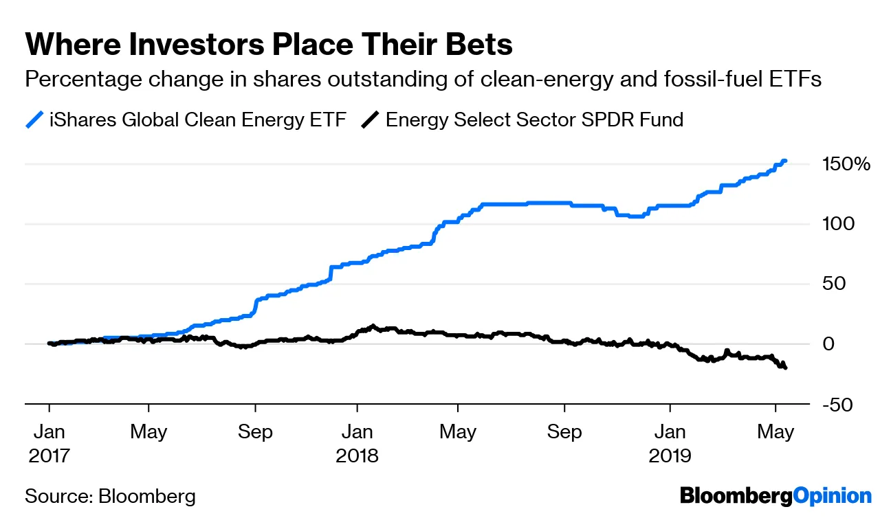 这两篇文章都关注边际变化,但你真的不需要眯着眼睛就能看到 投资者已经更青睐清洁能源 而非化石燃料,Matthew Winkler 写道。在唐纳德“清洁煤”特朗普以化石燃料优先的平台成为总统的两年多时间里,化石燃料股票下跌了12%,落后于标准普尔500指数。在同一时期,绿色能源股票上涨了50%,Matt写道。相关ETF之间的差距更为明显:
