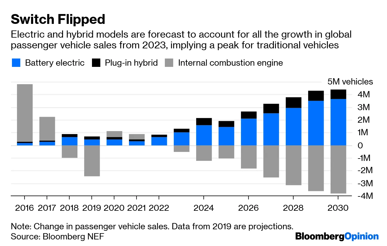 电动汽车仍然只是汽车行业的一小部分,并且可能 在一段时间内保持这种状态,正如 Anjani Trivedi 昨天所写。但再次强调,利润率讲述了一个更为乐观的故事,Liam Denning 写道:电动汽车将很快占据 全球汽车销售增长的全部,根据彭博社NEF的预测: