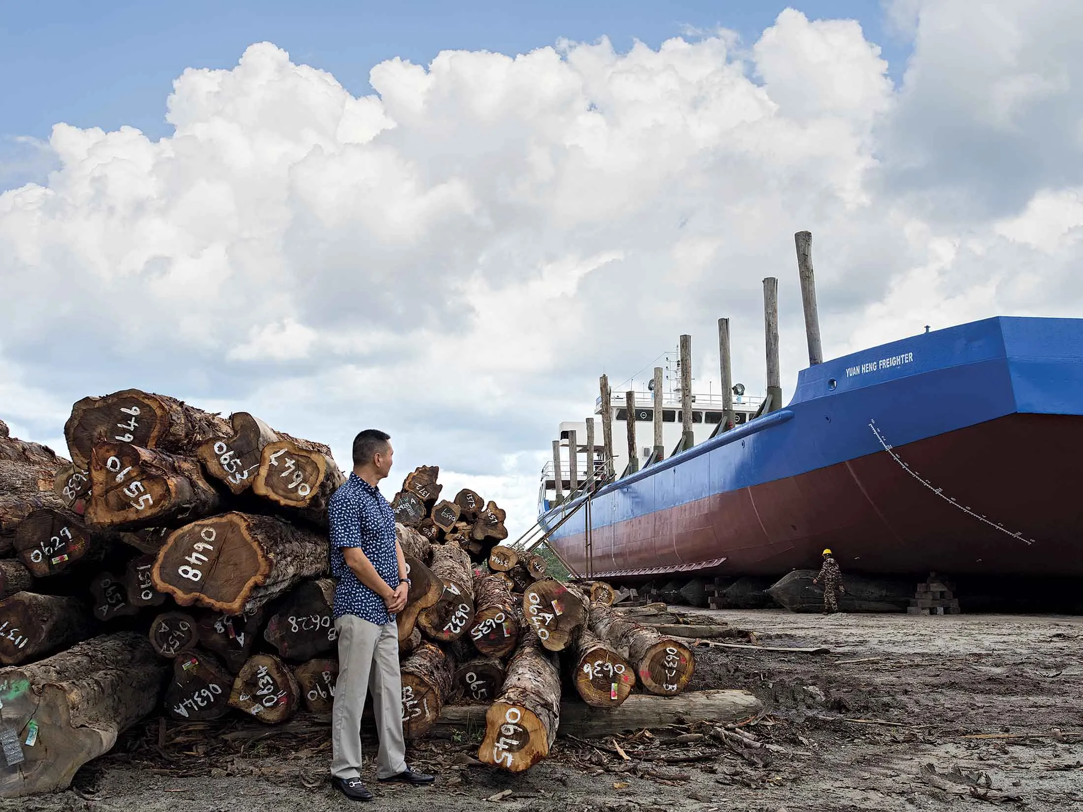陈明,荣安公司的老板,正在检查一艘木材驳船。这家中国公司在2017年获得了200万英亩的伐木权。它已申请贷款,在其特许经营区内的所有可收获树木上嵌入传感器,以跟踪它们在供应链中的移动。摄影师:卢卡斯·福格利亚,彭博商业周刊圭亚那可能会向其他贫穷国家证明,雨林可以在不被砍伐的情况下实现货币化。但戈宾意识到这一时刻尚未到来。“你可以把房子的产权拿到银行去借钱。为什么?因为市场给房子赋予了价值。我们需要看到雨林在同样的价值水平上,”他说。“保护必须是市场驱动的。健康森林的长期利益比伐木或采矿的短期利润更有价值。”