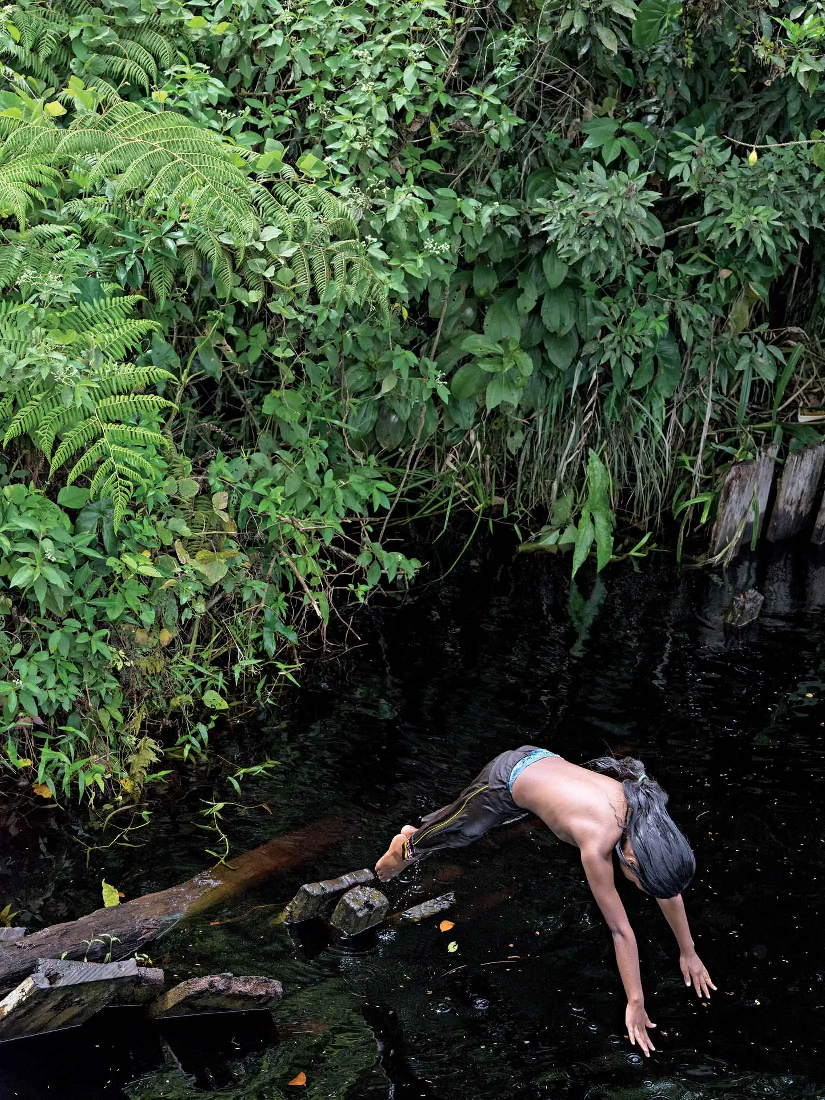 一名土著男子跳入阿鲁卡河。圭亚那是九个土著部落的家园,但他们的人口不到10%。黑水表明水是干净的。雨林的根系使水变黑。摄影师:Lucas Foglia 为《彭博商业周刊》拍摄