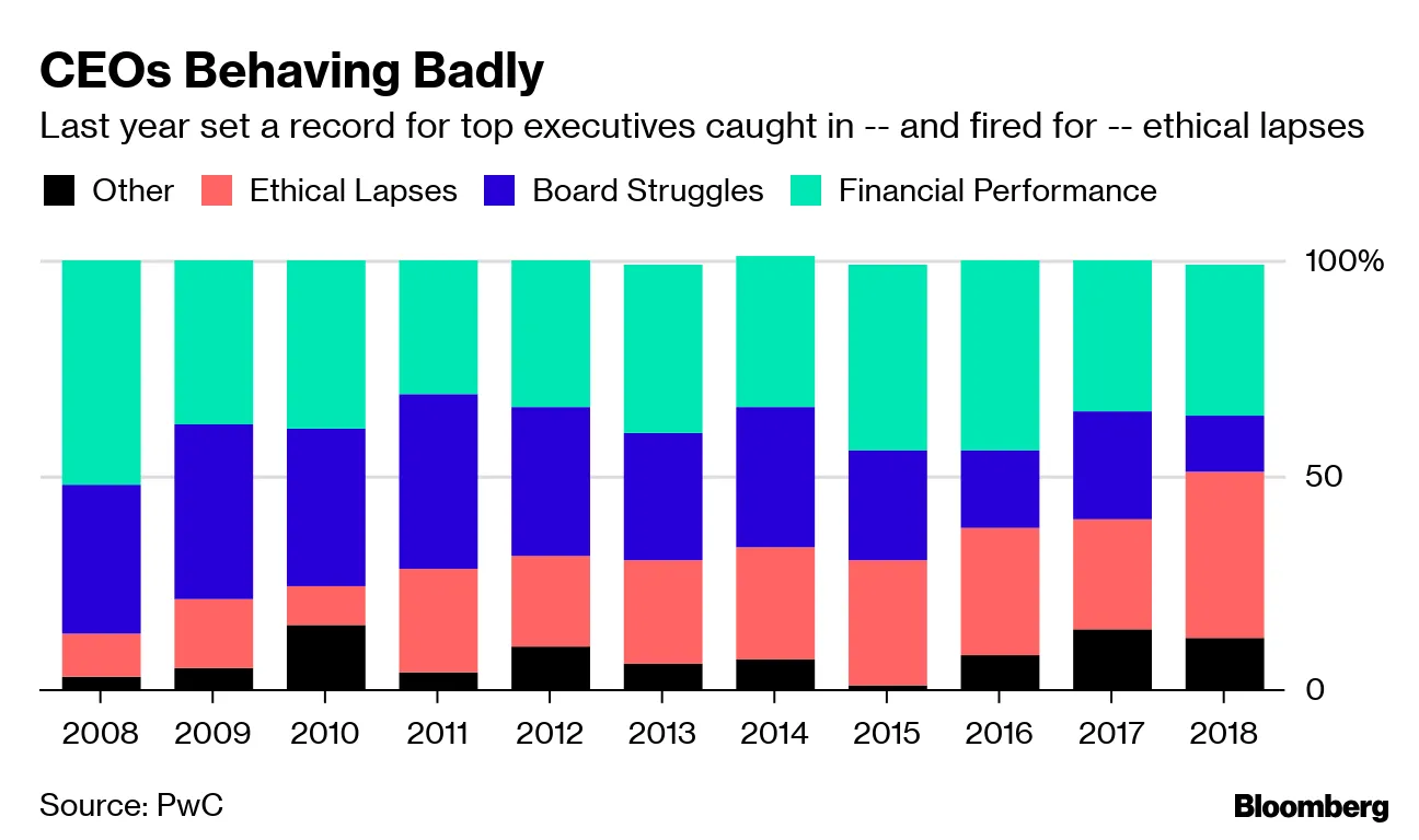 根据普华永道的一项研究,去年创纪录的18%的首席执行官被更换,更多的高管因道德失误被迫离职,而不是因业绩不佳或与董事会的分歧被解雇。这是该研究19年历史上首次道德失误成为首席执行官更替的主要原因。