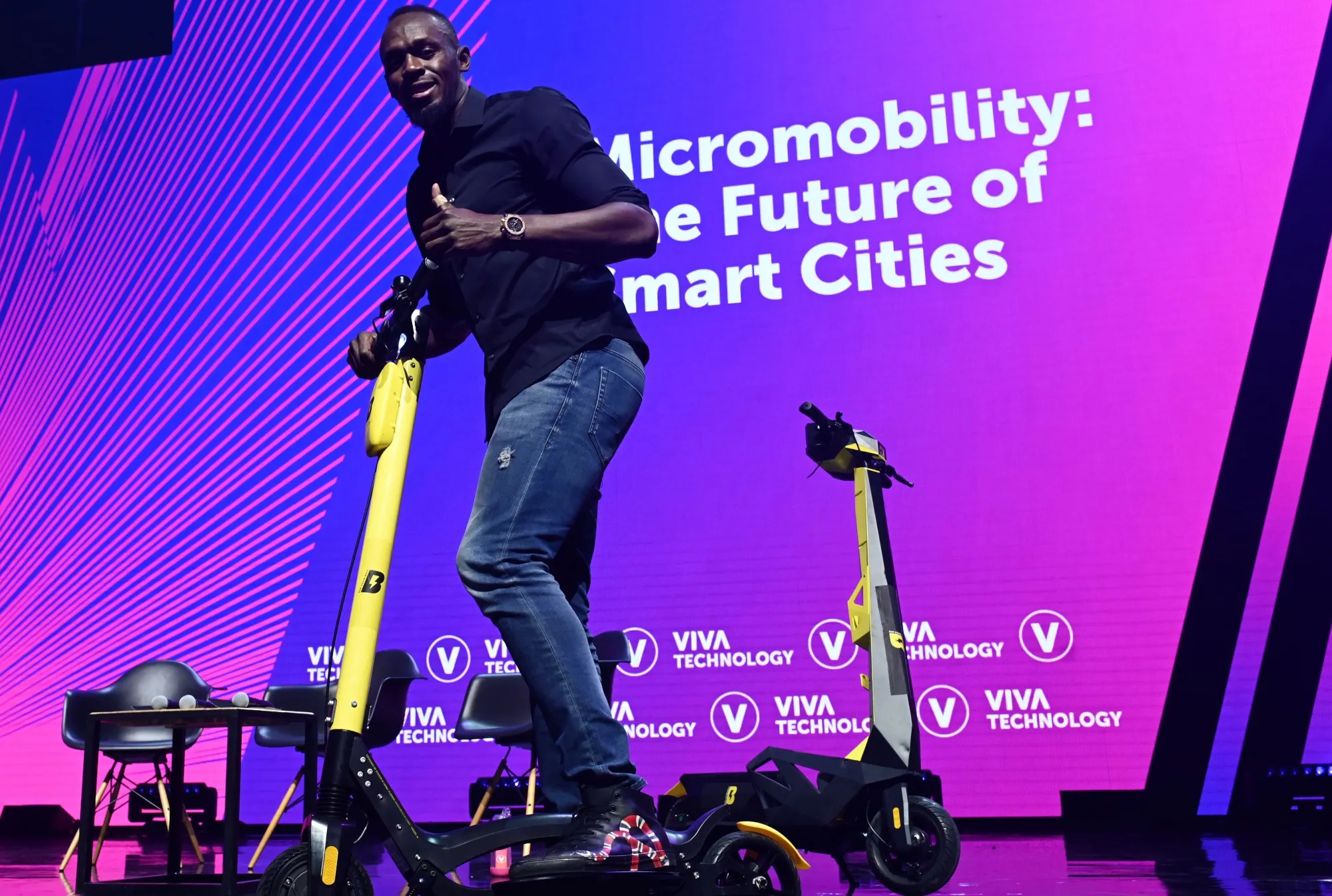 “移动的未来.” 传奇短跑运动员乌赛恩·博尔特在巴黎推出了一队电动滑板车,以应对交通造成的环境损害。