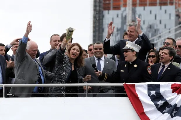 纽约市市长比尔·德布拉西奥(右后方)在副市长阿丽西亚·格伦为午餐盒命名时欢呼,这是最终将有20艘新渡轮中的第一艘,时间是2017年4月17日。迈克·塞加尔/路透社你无法逃避这个问题。这并不像旧金山,你可以写一张支票就了事。开发商给你钱当然很好,但实际上建造永久性可负担住房要困难得多。这运作得非常好,全球许多其他城市都在将其视为潜在的模型。