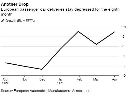 英国脱欧动荡再次影响欧洲汽车销售,4月份销量连续第八个月下降,因英国需求疲软。月度交付量下降1%,至122万辆。糟糕的表现反映了中国这一全球最大汽车市场需求的减弱,并增加了汽车制造商的逆风。全球贸易紧张局势已使该行业保持警惕,美国给欧盟和日本180天达成汽车进口和关税协议。