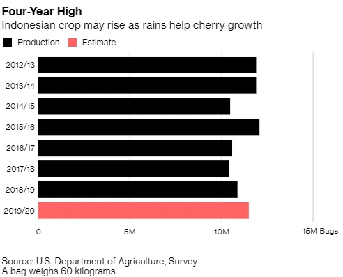 你的咖啡可能会变得更便宜。印尼是第三大罗布斯塔咖啡豆生产国,预计2019年的产量将达到四年来的最高水平。根据彭博社汇编的交易商中位数估计,农民在未来几个月可能会收获1150万袋,或69万吨。这比去年增加了超过5%。
