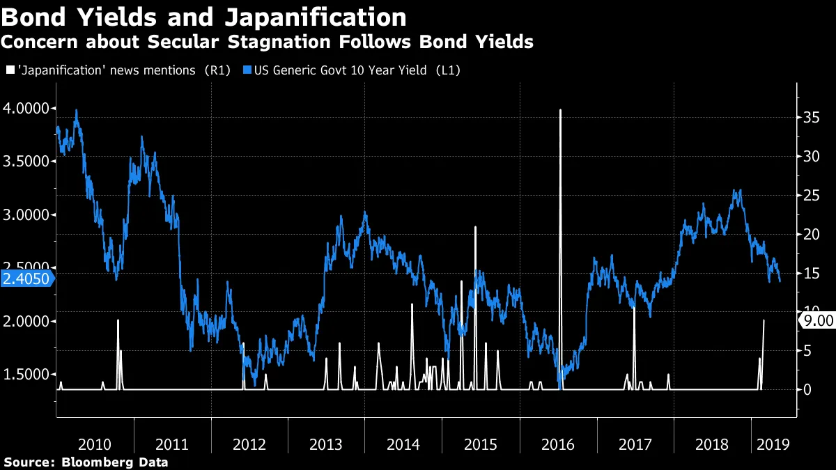 在下面的图表中,白线显示了“日本化”一词在彭博新闻趋势功能中每周的出现次数。(对于有终端的人,该功能是NT。)2016年夏季,英国脱欧公投后债券收益率的下降伴随着对日本化的巨大担忧。现在,日本式停滞的风险似乎更大,至少对于欧元区而言,但这次债券市场的动荡并没有伴随类似的猜测,即欧洲或美国将被日本化。这一次,显然,较低的债券收益率似乎被视为一件好事,而不是灾难的预兆:
