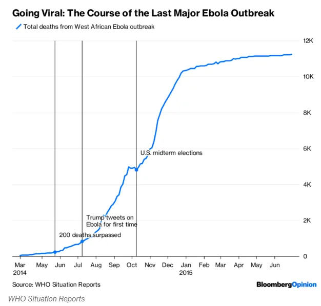 作为参考,到目前为止,已经有超过1,100例可能的死亡。让我们将其与2014年在西非爆发的广为宣传的疫情进行比较。当时记录的死亡人数达到如此之多时,特朗普作为一名私人公民,已经在推特上谈论对美国的危险,而这个问题在那年的中期选举中成为了一个政治问题。而且在任何改善之前,疫情会变得更加严重: