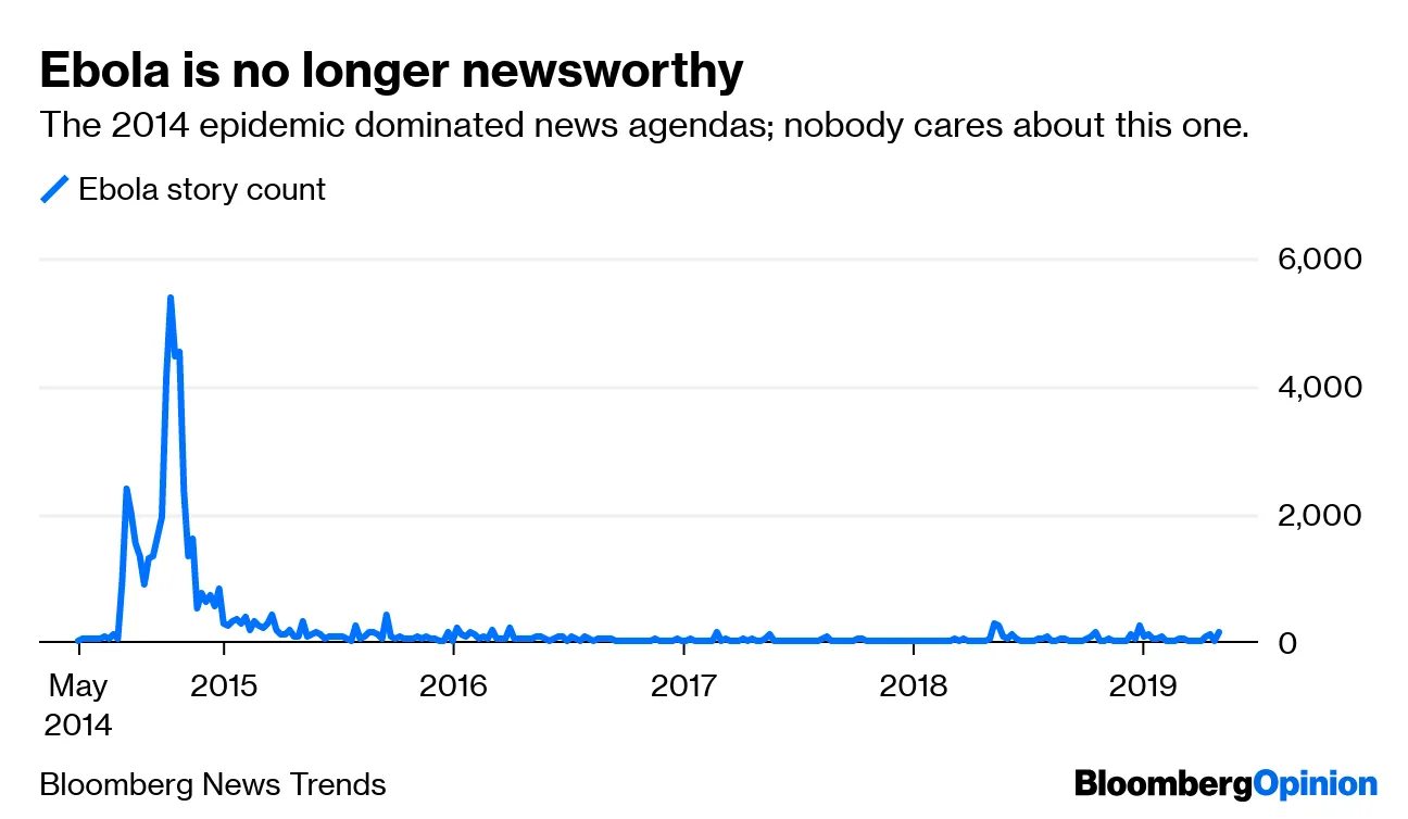 如果特朗普像他对利比里亚、塞拉利昂和几内亚疫情的推特那样热衷于谈论刚果民主共和国人民的厄运,可能会对受苦的人口有所帮助。市场可能更希望他不要这样做:2014年的埃博拉恐慌在许多方面都是一个可耻的事件,并伴随着市场的下跌。这次新的疫情对世界发达经济体没有造成损害。但它可能造成损害的风险是真实且不断增长的,就像在2014年疫情的同一阶段一样。五年前,市场似乎对它感到非理性恐惧。这一次,他们看起来非理性地平静。