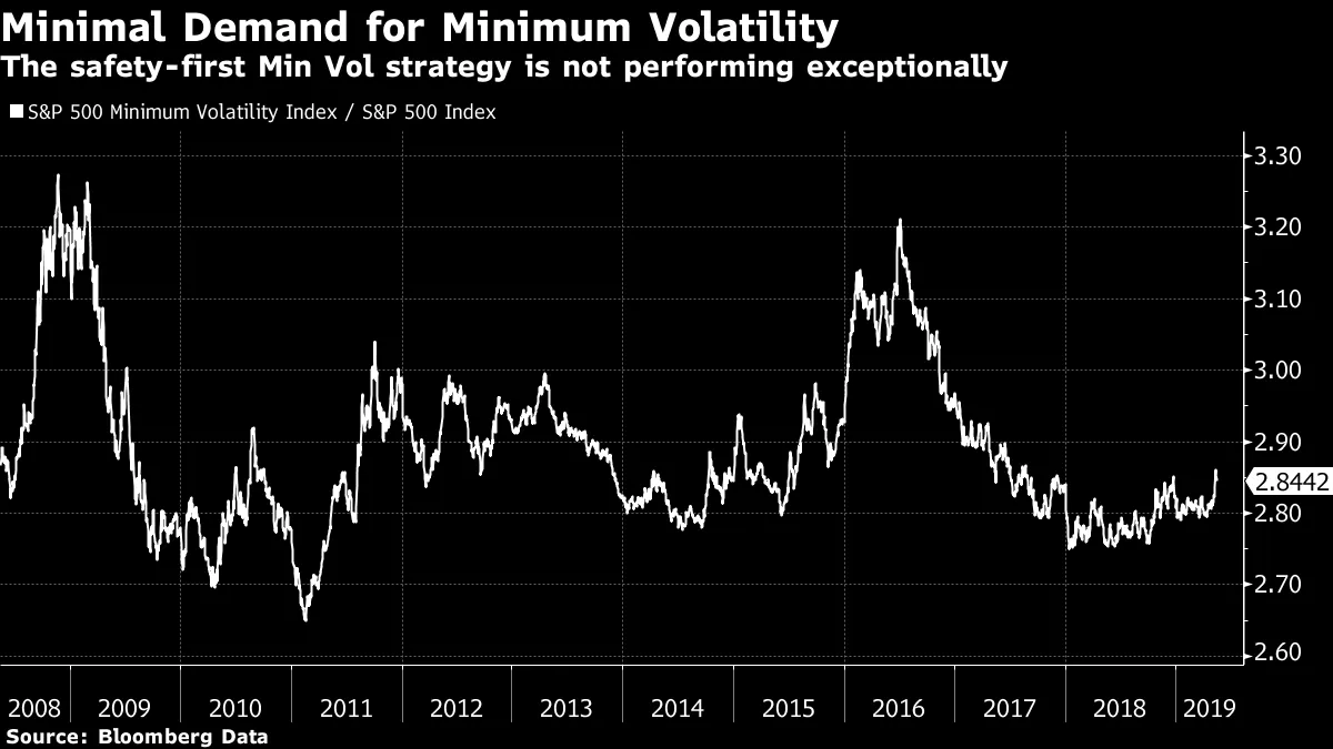 寻找有效的策略也几乎没有给出投资者之间存在巨大恐惧的感觉。以下图表显示了标准普尔500最低波动率指数。最低波动率策略购买相对平静的低波动率股票,这些股票在压力时期往往表现优于其他股票。这在近年来一直是交易所交易基金销售人员中非常受欢迎的策略,但最近表现不佳: