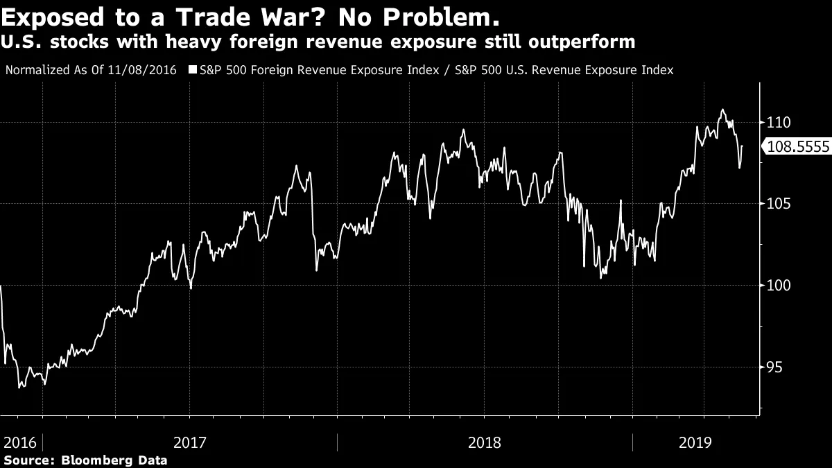在美国股市内部,没有明显迹象表明贸易恐惧促使投资者采取行动。以下图表显示了自2016年大选以来,最依赖外国收入的标准普尔500股票与最依赖国内收入的股票的指数。大选后,投资者立即抢购以国内为重点的安全公司,但自那时以来,出口商一直占据主导地位。是的,出口商上周的抛售更多,但这只是对持续强劲相对表现的轻微修正。