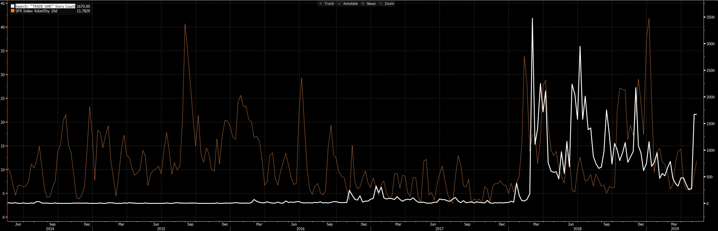 至于贸易本身,我尝试将“贸易战”一词的出现次数与过去五年标准普尔500指数的波动性进行映射。结果很混乱,这要归功于我在图形功能上的无能,但看起来是这样的: