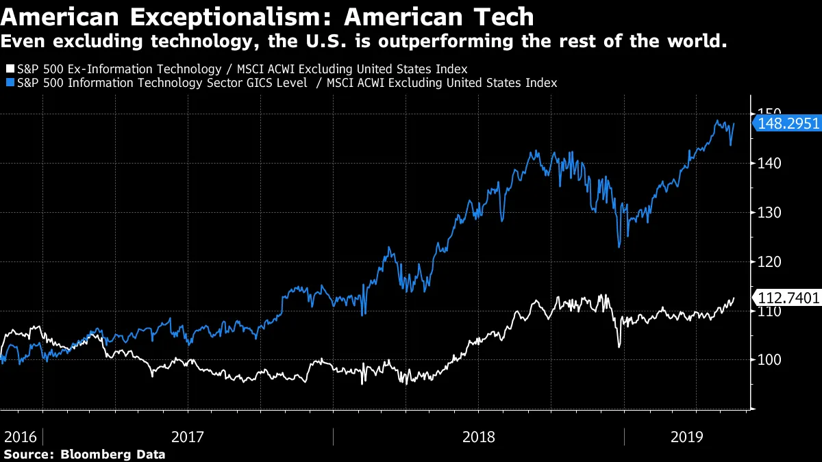 贸易战主要是双边事务,这将推高消费者价格并损害美国和中国出口商的前景。但自2016年以来,贸易争端几乎没有影响到美国相较于世界其他地区的持续超越表现。这在很大程度上与硅谷和美国在科技领域的主导地位有关。正如图表所确认的,自选举以来,标准普尔500科技板块的表现远超MSCI的全球股票市场指数,而这在过去几天仅仅受到轻微影响。与此同时,标准普尔500的其他部分相比于世界其他地区表现远不如人意,但在贸易冲突期间完全没有出现任何修正:
