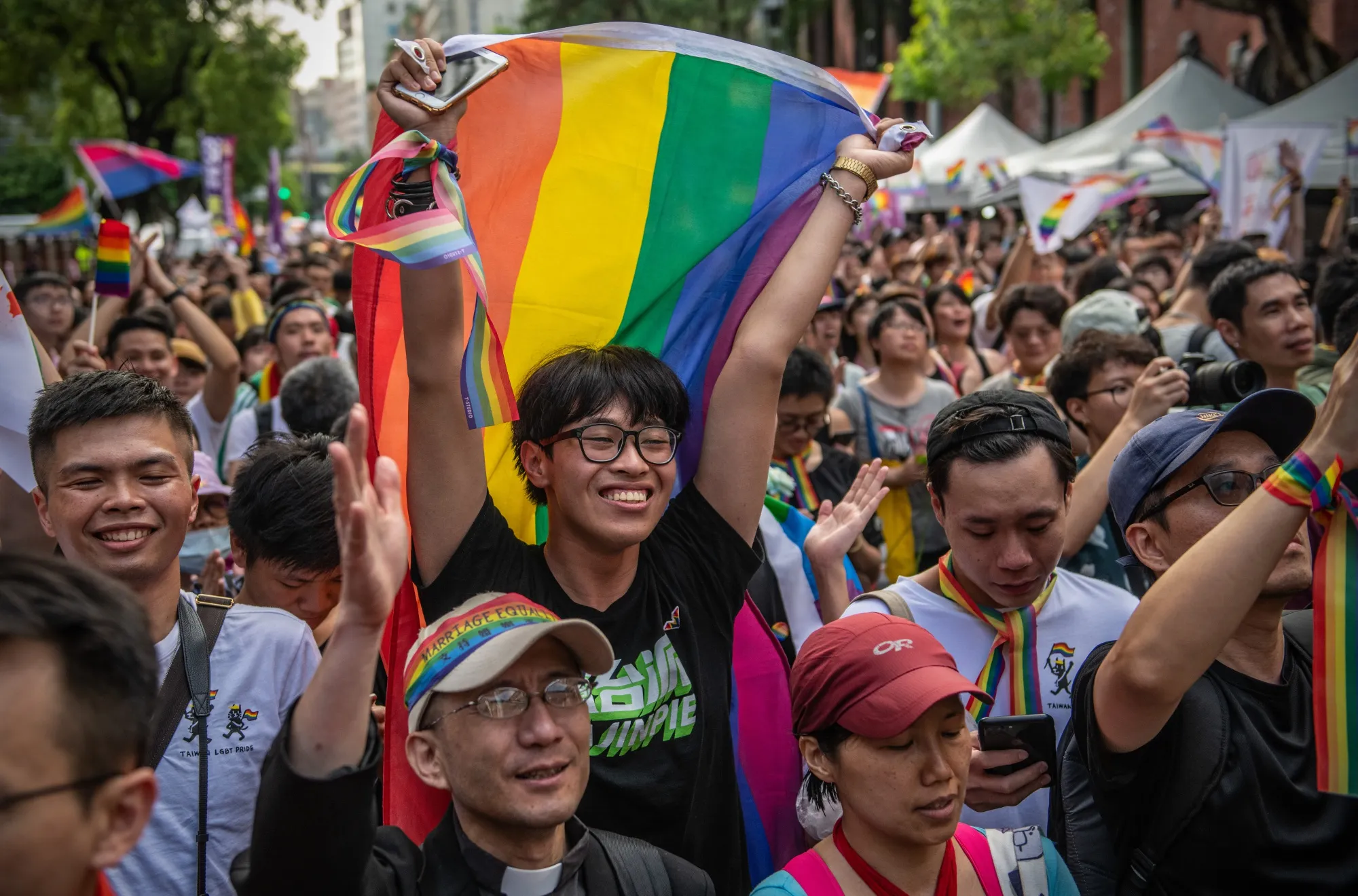 台北,台湾 - 5月17日:人们在2019年5月17日庆祝台湾立法院投票通过同性婚姻合法化。台湾成为亚洲第一个合法化同性婚姻的国家,立法者在周五投票允许同性伴侣享有完全的法律婚姻权利,包括税收、保险和子女监护等领域。成千上万的同性恋权利支持者在国家首都的立法院外聚集,庆祝结果的宣布。该法案将于5月24日生效。(照片由Carl Court/Getty Images提供)摄影师:Carl Court/Getty Images AsiaPac1. 台湾在平等方面迈出了重要一步。作为亚洲的历史性第一,该岛在裁定禁止同性婚姻的法律违宪两年后合法化了同性婚姻。