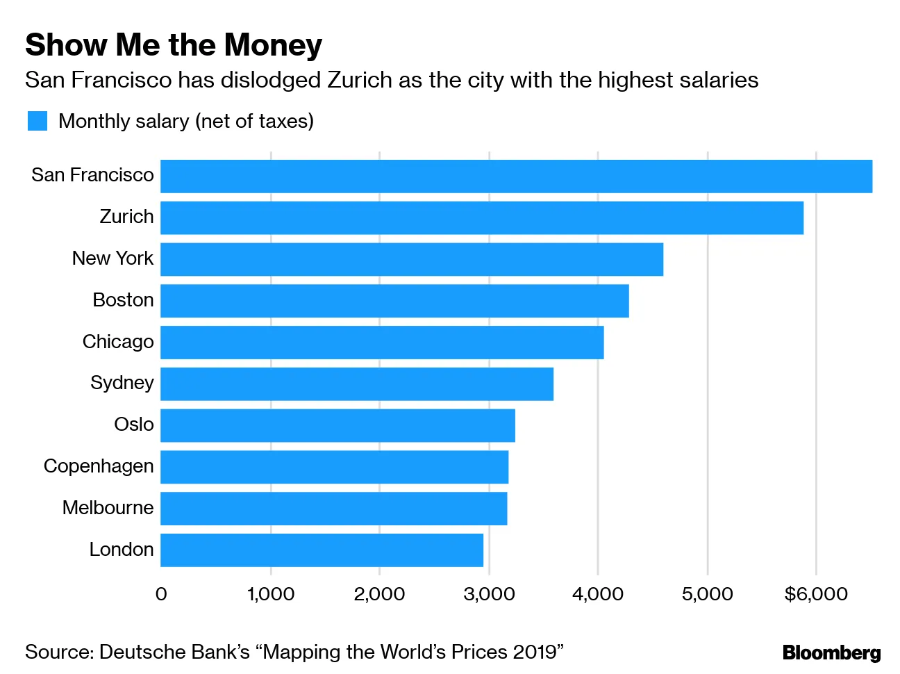 想要提高薪水和生活方式吗?如果你还没有,试试旧金山。根据德意志银行的《2019年全球价格地图》,这座城市超越苏黎世,成为薪水和租金后可支配收入最高的地方。瑞士城市在生活质量方面仍然名列前茅,只是不要指望爱情便宜——它仍然是约会最昂贵的地方。