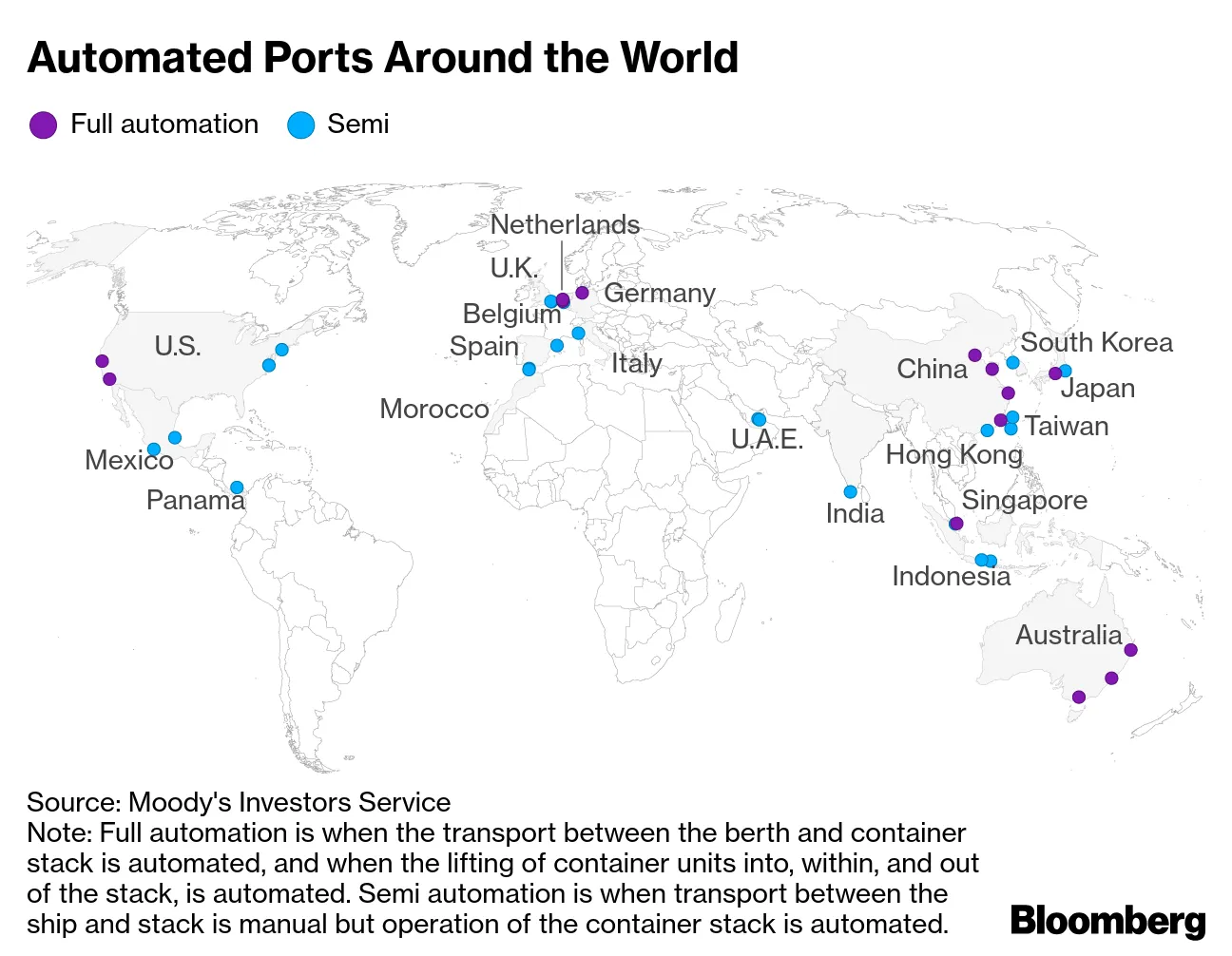 - 贸易斗争正在对北美最大的航运码头洛杉矶的400号码头造成影响,官员们正在应对因争端而导致的业务下降,同时也在朝着更自动化的未来努力,这两者对码头工人来说都是坏消息。