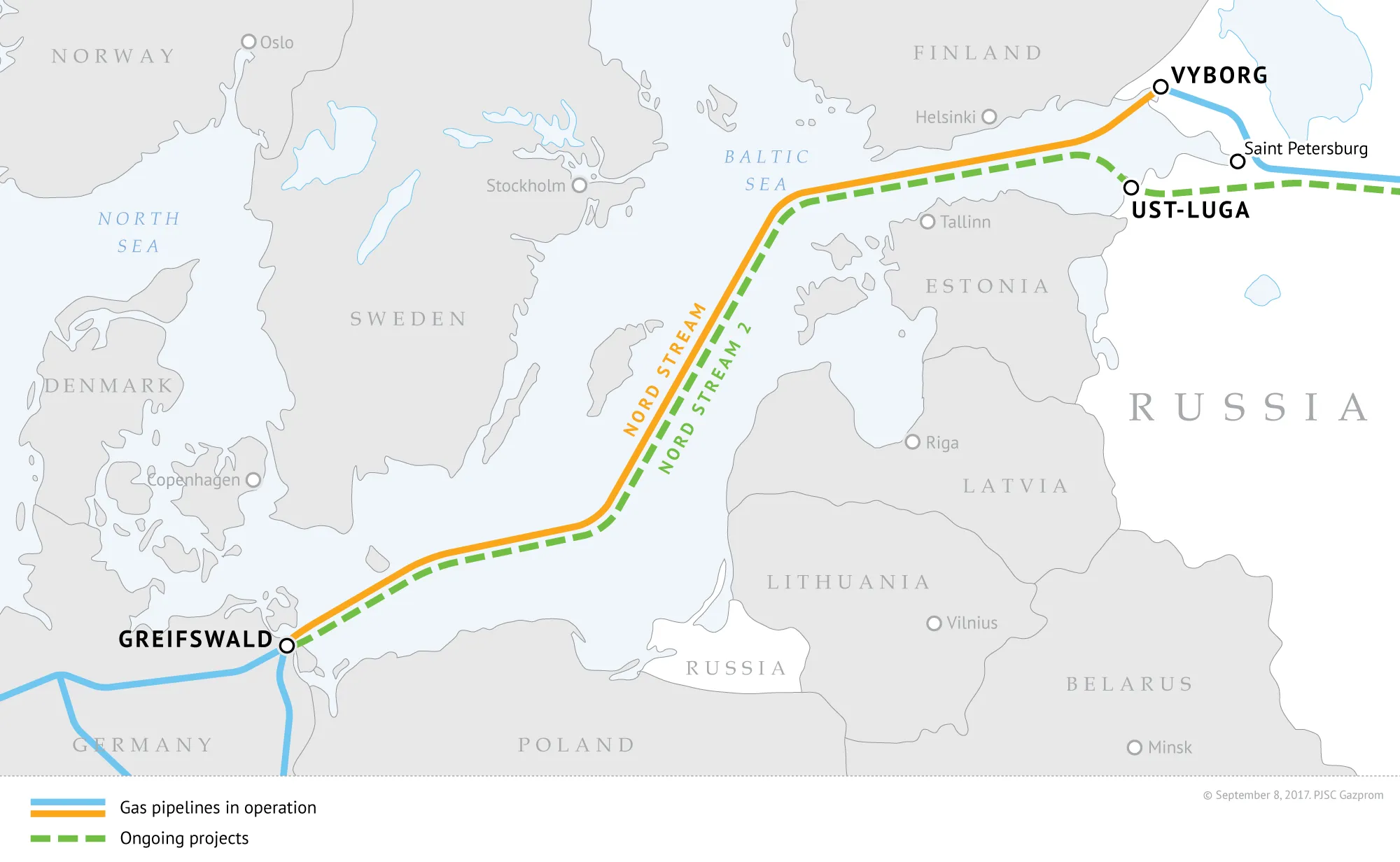 由俄罗斯于2015年发起的1220公里(758英里)诺德流2号海底管道连接德国。由俄罗斯于2015年发起的1220公里诺德流2号海底管道连接德国。