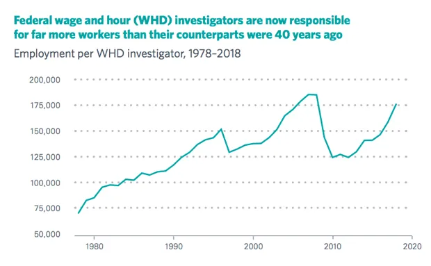 经济政策研究所有两种力量正在侵蚀这些工作场所权利的执行。一种是紧缩:用于保护工人的公共机构的州和联邦预算已经削减到极限,导致它们人手不足,即使它们监控的劳动力在增长。例如,在俄勒冈州,州劳动部门有35名工资和工时执法调查员——这意味着每名调查员的案件负担大约是4,400家企业和55,000名工人。这是本研究中六个州中最好的比例:马萨诸塞州的19名调查员每人负责近189,000名工人。