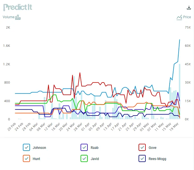 另一个不确定因素来自领导层。梅将在接下来的几周内辞职,但保守党的选举机制意味着选择她的继任者将需要一些时间。党内的国会议员将在威斯敏斯特投票,缩小候选人范围至两人,然后这对候选人将提交给全党全国会员进行邮寄投票。保守党的活动人士往往更倾向于支持脱离欧盟。有许多候选人,但有一个明显的领先者:前外交大臣鲍里斯·约翰逊。根据预测市场PredictIt,过去三个月中下一任保守党领导人的赔率变化如下: