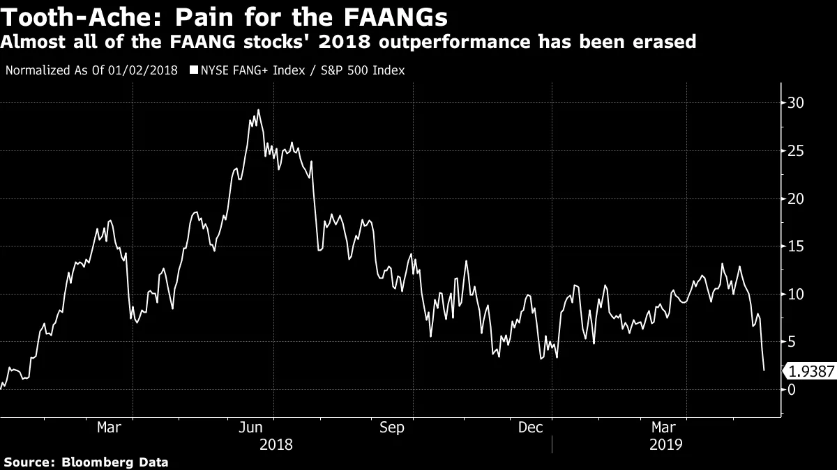昨天的信件以一张神秘的图表结束,但没有解释。我决定由于时间压力不写关于FAANGs的内容,但忘记删除图表。所以,这里再次呈现。基本观点是,FAANG股票(Facebook、Apple、Amazon、Netflix和Google)的领导地位已经成为过去。自2018年初以来,它们在美国市场的表现远超其他股票,但这种超额表现现在几乎完全消失。坏消息是,对主导互联网提供商的前景不再抱有如此乐观的态度。好消息是,曾经看起来过度高估和拥挤的交易在没有太多痛苦的情况下已基本得到纠正。市场可能会因为去掉锋利的牙齿而变得更好。