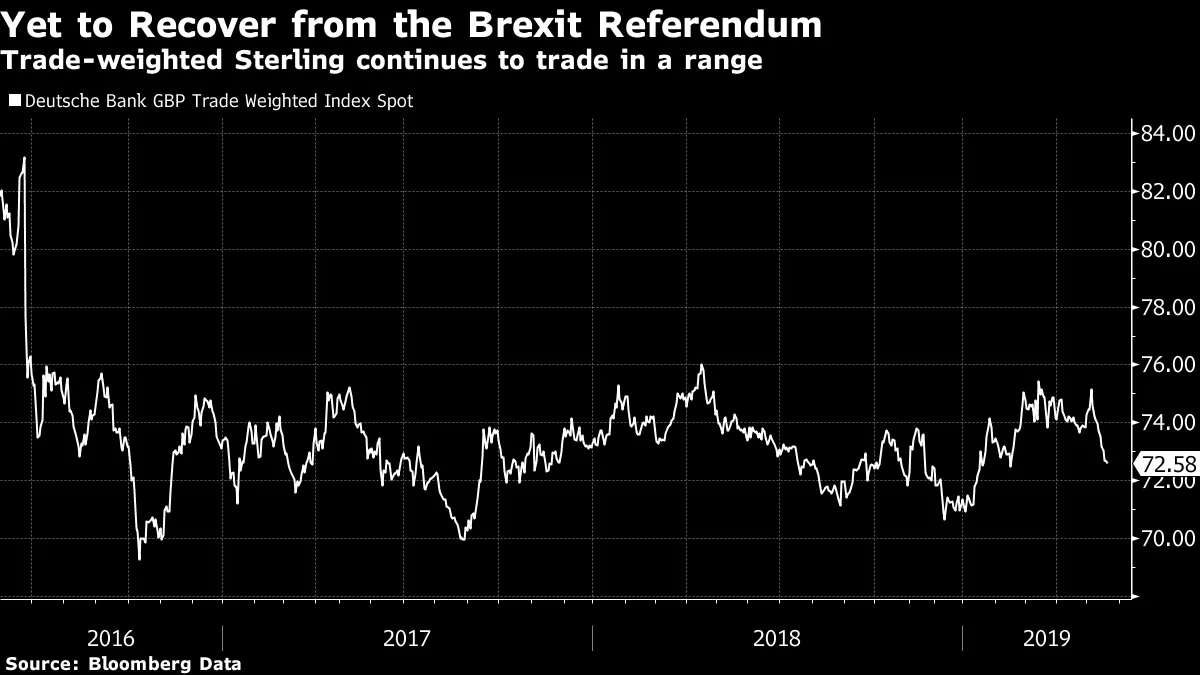 长期来看,自公投震惊以来,英镑一直在一个区间内交易,至今已近三年。这反映了概率的平衡,谈判达成的“软”脱欧被视为对英镑有利,而“无协议”退出,即英国与欧盟没有达成退出协议,并按照世界贸易组织的条款进行贸易,在我看来被视为最负面的。两个月前,当欧盟同意英国可以有直到10月31日的时间来达成妥协时,普遍认为“无协议”已经彻底被排除在外。自那时以来,两次寻找妥协的尝试失败,我认为“无协议”再次坚决回到了桌面上。