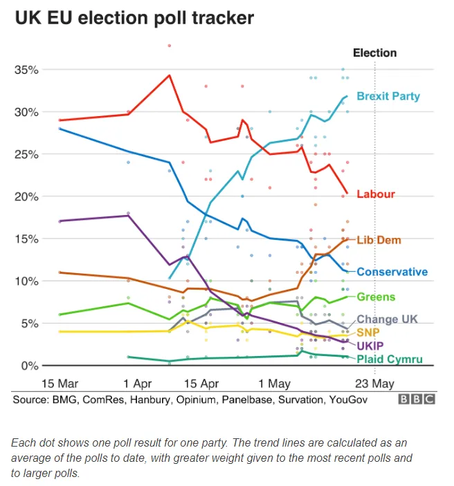 支持这一点的是即将在本周举行的欧洲议会选举的民调,这些选举将在整个欧盟(包括仍然是成员国的英国)进行。这里有一些关于欧盟民调的好评。所有这些与BBC编制的这一民调总体一致: