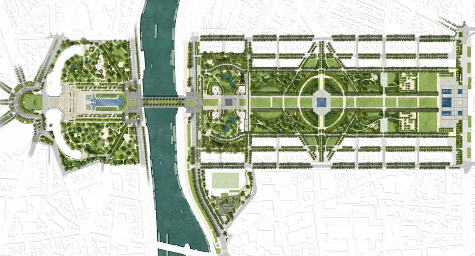 游客将步入Pont D’Iena,这是通往塔楼的主要桥梁,交通将被一条双排树木的林荫大道所取代。铺砌的人行道将允许紧急车辆通行。右岸的交通隧道将创造另一个步行广场,称为Place Branly,而沿河的花园长廊将延伸至高架的Bir Hakeim地铁站,这是通往塔楼的另一个主要通道。