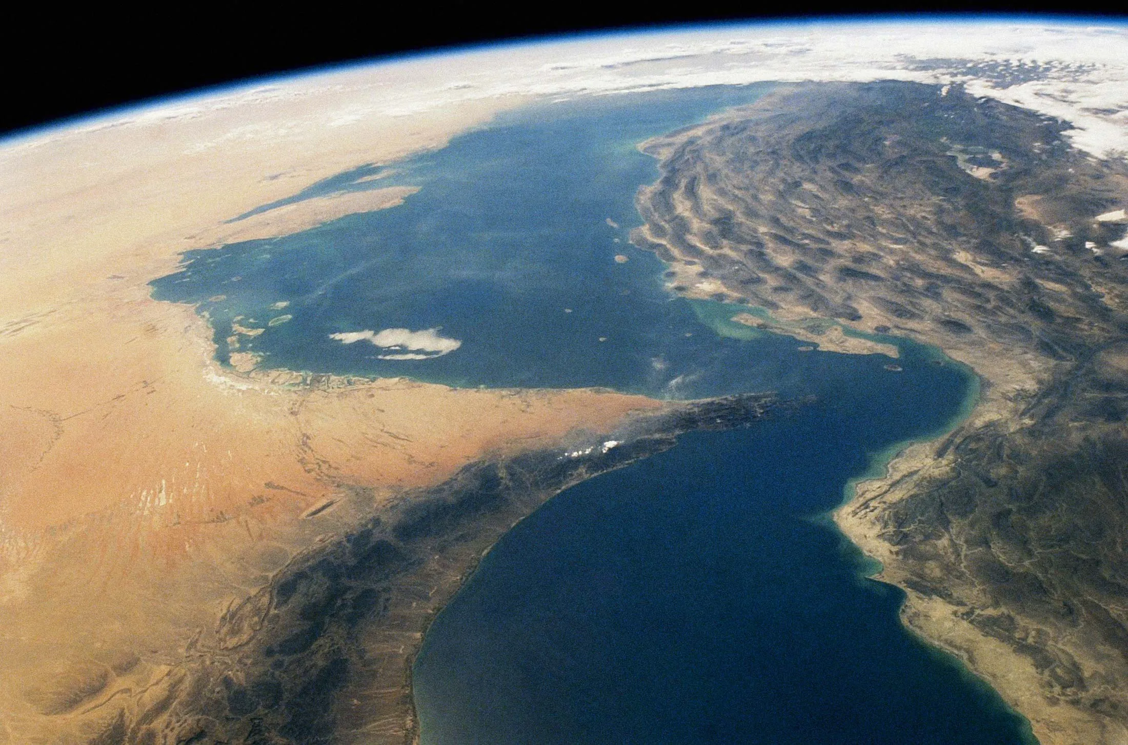 霍尔木兹海峡位于波斯湾和阿曼湾之间,从国际空间站看到的景象。霍尔木兹海峡位于伊朗和阿拉伯联合酋长国之间。