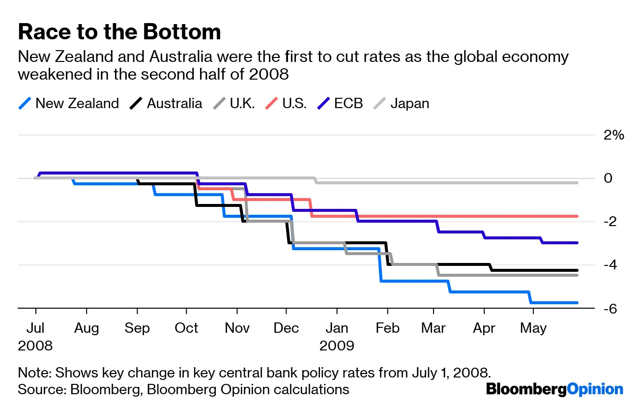 是时候关注 澳大利亚和新西兰的情况了。它们的小型、依赖贸易的经济体和开放的资本市场意味着它们通常是 主要北半球国家出现 麻烦的早期迹象,戴维·菲克林为彭博社观点撰文称。2008年,它们的激进降息是富裕国家走向零利率政策的早期指标。它们是小金丝雀,但当它们停止鸣叫时,要小心。