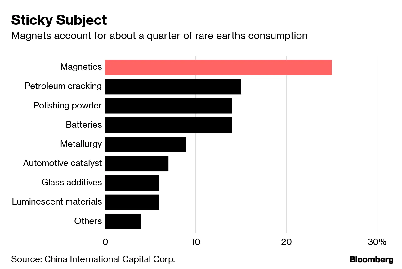 - 美国的组件制造商,无论是用于汽车还是军事设备,如果中国实施其威胁,可能会遭受“毁灭性”的打击,科技金属研究公司表示。美国约80%的稀土依赖中国。由于这些元素在贸易争端中受到关注,中国的生产商在最近几周反弹。