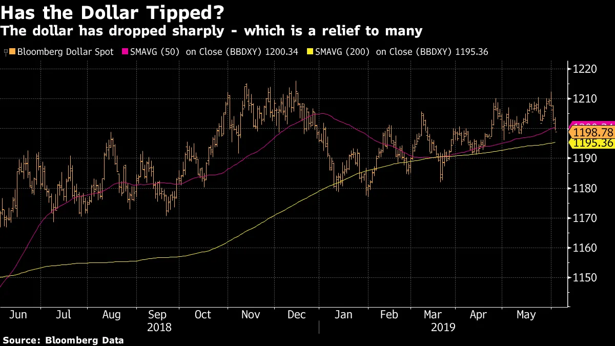 与股市的兴奋相比,股市的反转仍不足以告诉我们过去几个月的趋势已经结束,不妨看看美元。正如我在周一所评论的,美元在与其他国家的收益差缩小的情况下仍然保持强劲,这一现象曾经让人感到困惑,因为国债上涨。看起来这可能在国债市场转变的同时达到了不可支持的荒谬点。(纽约梅隆银行的分析师可能是对的,这在很大程度上归因于对感知风险的调整,而不是收益的变化。但通过调整政治风险,疲软的美元可以减轻所有人的压力。)彭博美元现货指数迅速跌破其50日移动平均线,并接近200日移动平均线的重要技术支撑位。