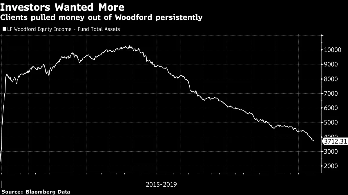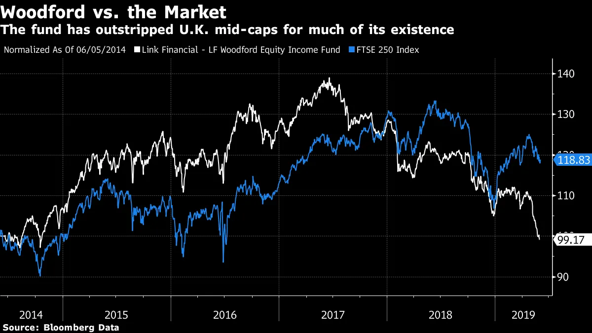不,星期二午餐时BBC新闻的头条并不是唐纳德·特朗普总统的访问,而是关于尼尔·伍德福德的垮台。对于非英国人来说,伍德福德是过去十年中最著名的英国基金经理之一。五年前,当他离开他在英维斯科永久基金的旧职位,成立自己的新基金时,掀起了巨大的轰动。现在他的旗舰基金因大量投资者撤资而关闭,无法赎回。资金跟随这位明星经理,认为他无论去哪里都能超越表现,但当他未能交付时却毫不留情地抛弃了他。