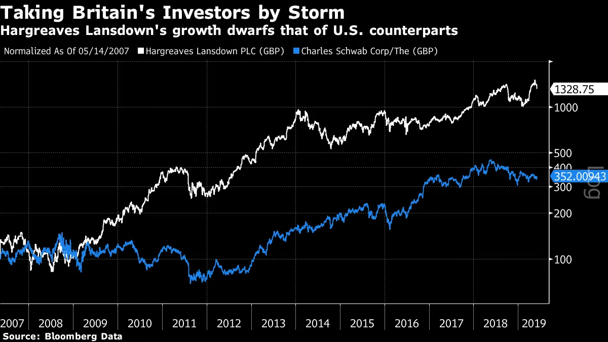 这让我想到了在这一事件中另一个有趣的附带损害的受害者。当我大约30年前开始关注英国基金管理行业时,哈格里夫斯·兰斯当是一家活泼且激进的独立金融经纪公司。类似的公司有很多,但它找到了成长的方式。其商业模式可以用美国读者的理解来描述为介于查尔斯·施瓦布和美林证券之间——它提供一个便于买卖的交易平台,同时也提供建议。它坚定地支持主动管理而非被动管理。而且,从以下图表可以看出,其表现相当显著,自2007年以来,其股价远远超过查尔斯·施瓦布,即使排除货币影响,尽管它面临着本国市场更为疲软的障碍: