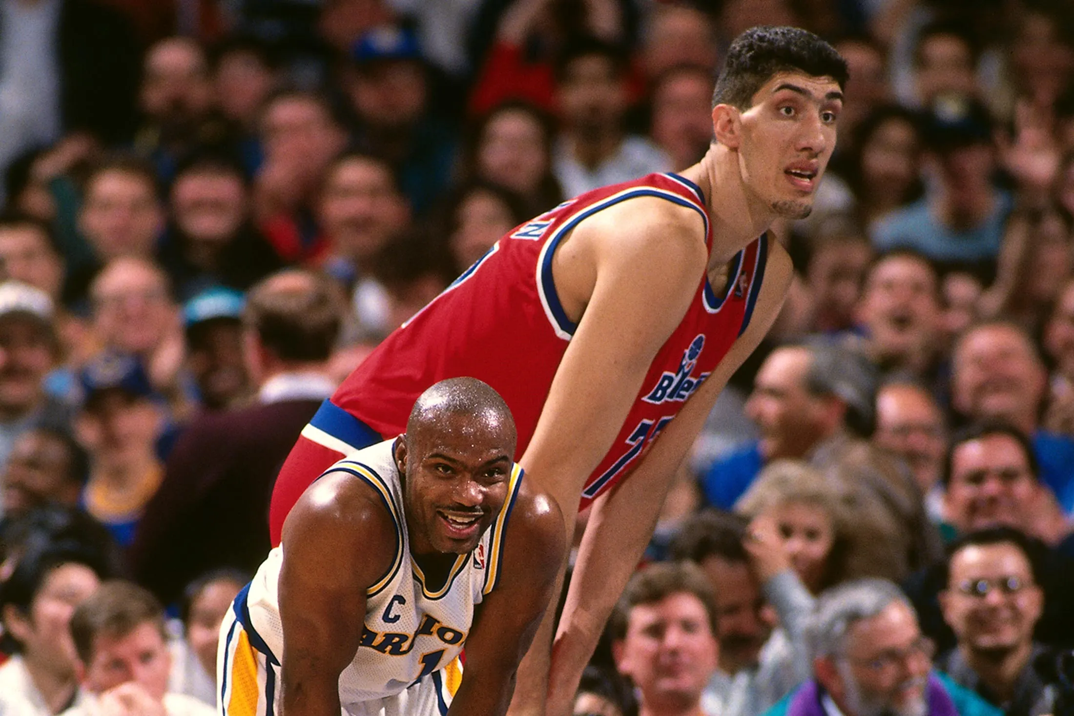 华盛顿子弹队的 Gheorghe Muresan #77 在1995年左右在加利福尼亚州奥克兰进行的一场比赛中站在金州勇士队的 Tim Hardaway #10 身后。摄影师:Brad Mangin/NBAE /Getty Images摄影师:Brad Mangin/NBAE via Getty Images