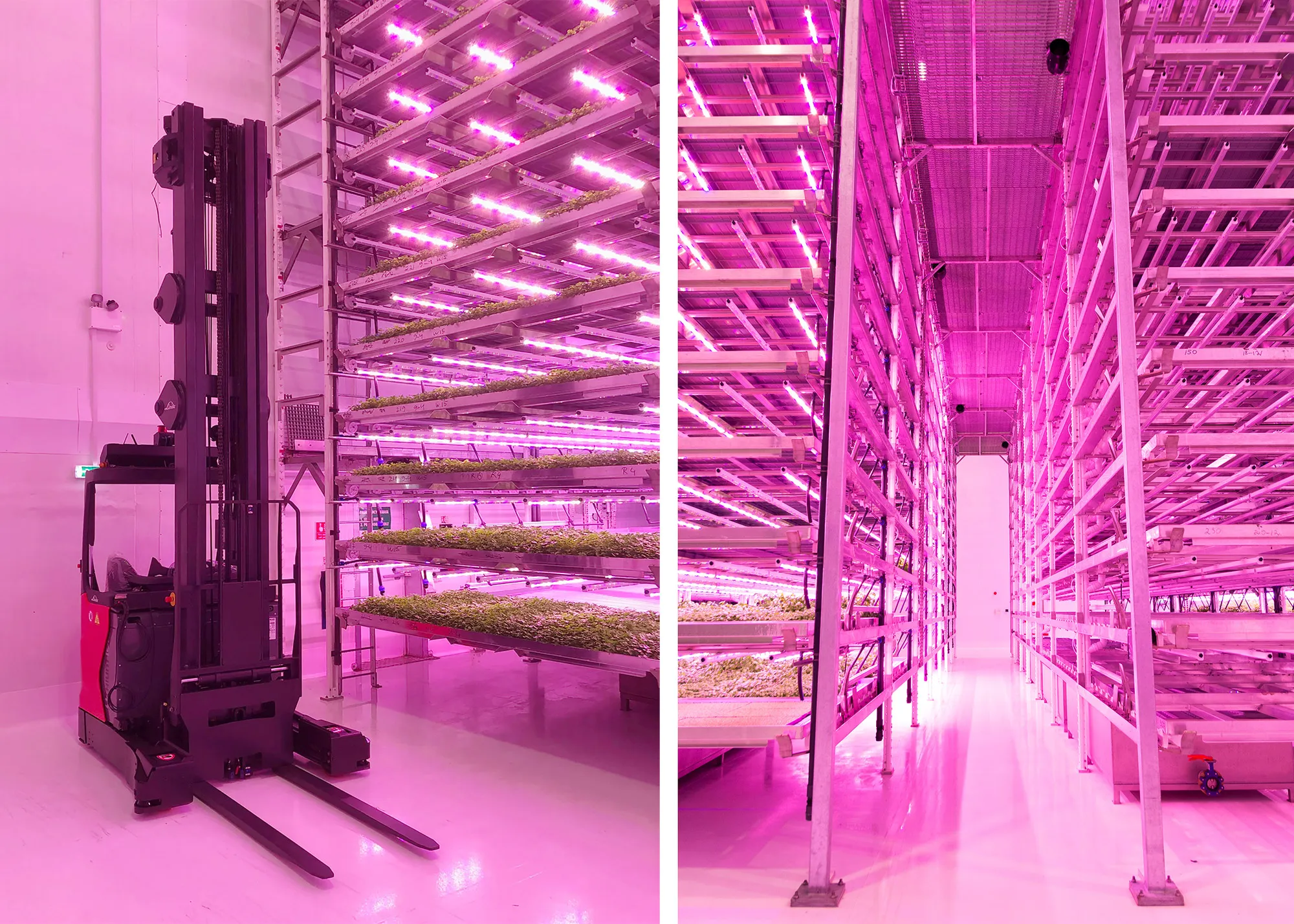 琼斯食品唯一的机器人弗兰克,左侧是位于英国斯肯索普的垂直农场。摄影师:霍莉·L·查林诺尔琼斯食品的垂直农场。摄影师:霍莉·L·查林诺尔/琼斯食品。
