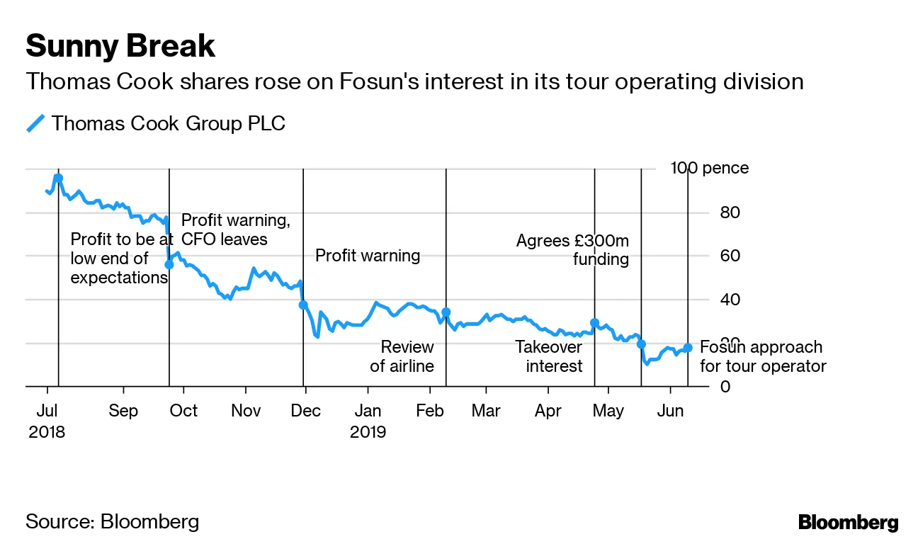 就像在家中一个糟糕夏季中的阳光假期的提议,托马斯·库克的股东们终于迎来了好消息:复星对其旅游运营部门的潜在收购感兴趣。这一举措为托马斯·库克提供了一些喘息之机,该公司一直在努力证明其仍然保留着大量的股权价值,安德烈亚·费尔斯特为《彭博社观点》写道。但这仍然是一个困境,股权投资者不会轻易庆祝。