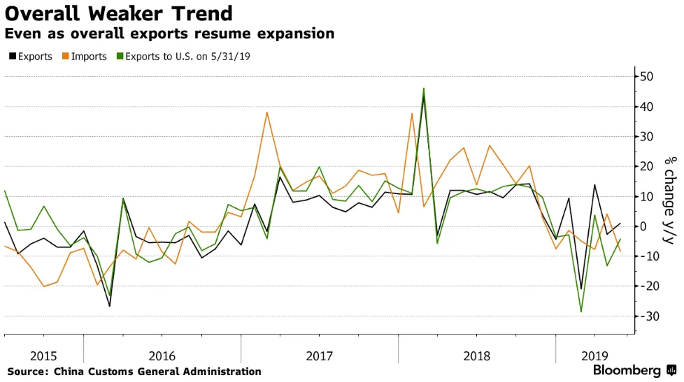 中国的进口在 五月骤降,出口的意外增长不足以消除人们对与美国的经济争端将加剧并损害全球经济的担忧。这增加了本月晚些时候在大阪举行的G-20领导人峰会上特朗普总统与习近平主席可能会晤的重要性。