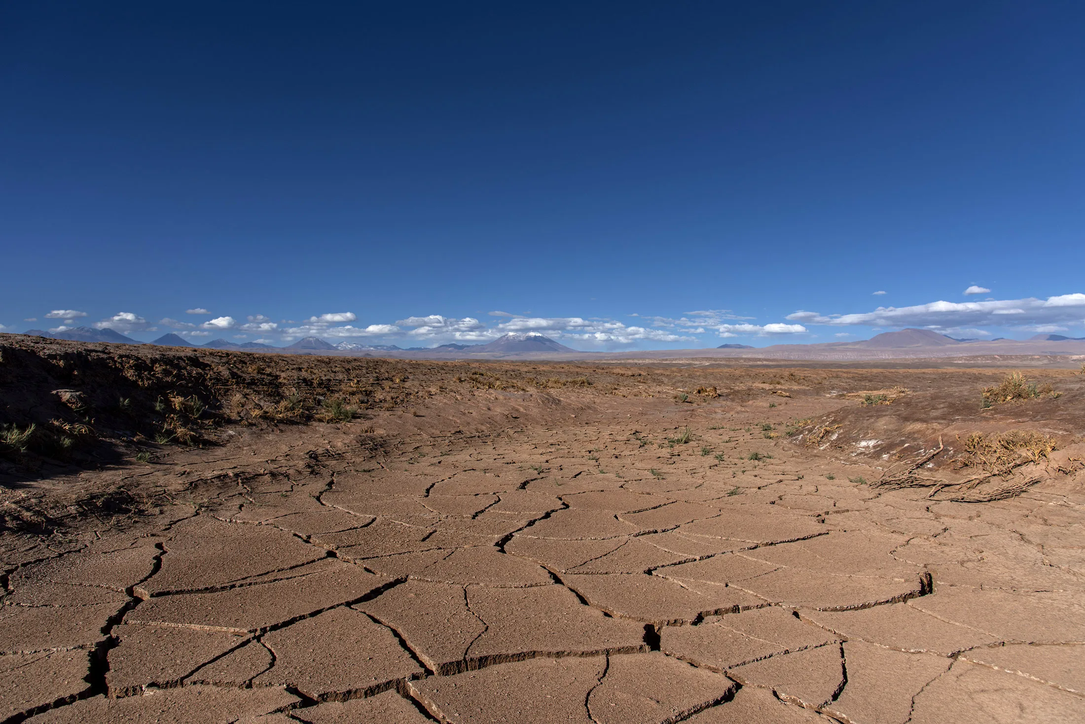 干燥和开裂的土地标志着一个区域,水被采矿公司从阿塔卡马盐沼的南端抽取。