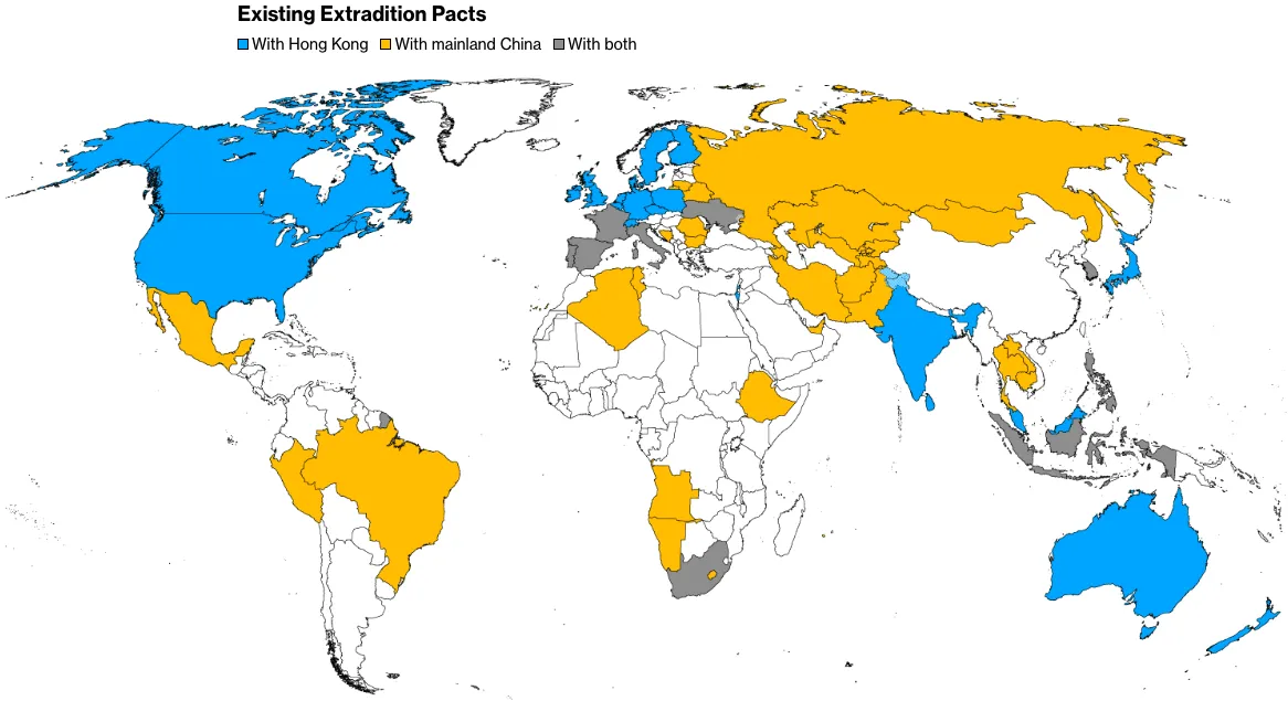 全球引渡协议。在与其他国家的协议方面,中国大陆和香港仅有九个是共同的。单独来看,香港与30个国家有协议。中国总共有39个。