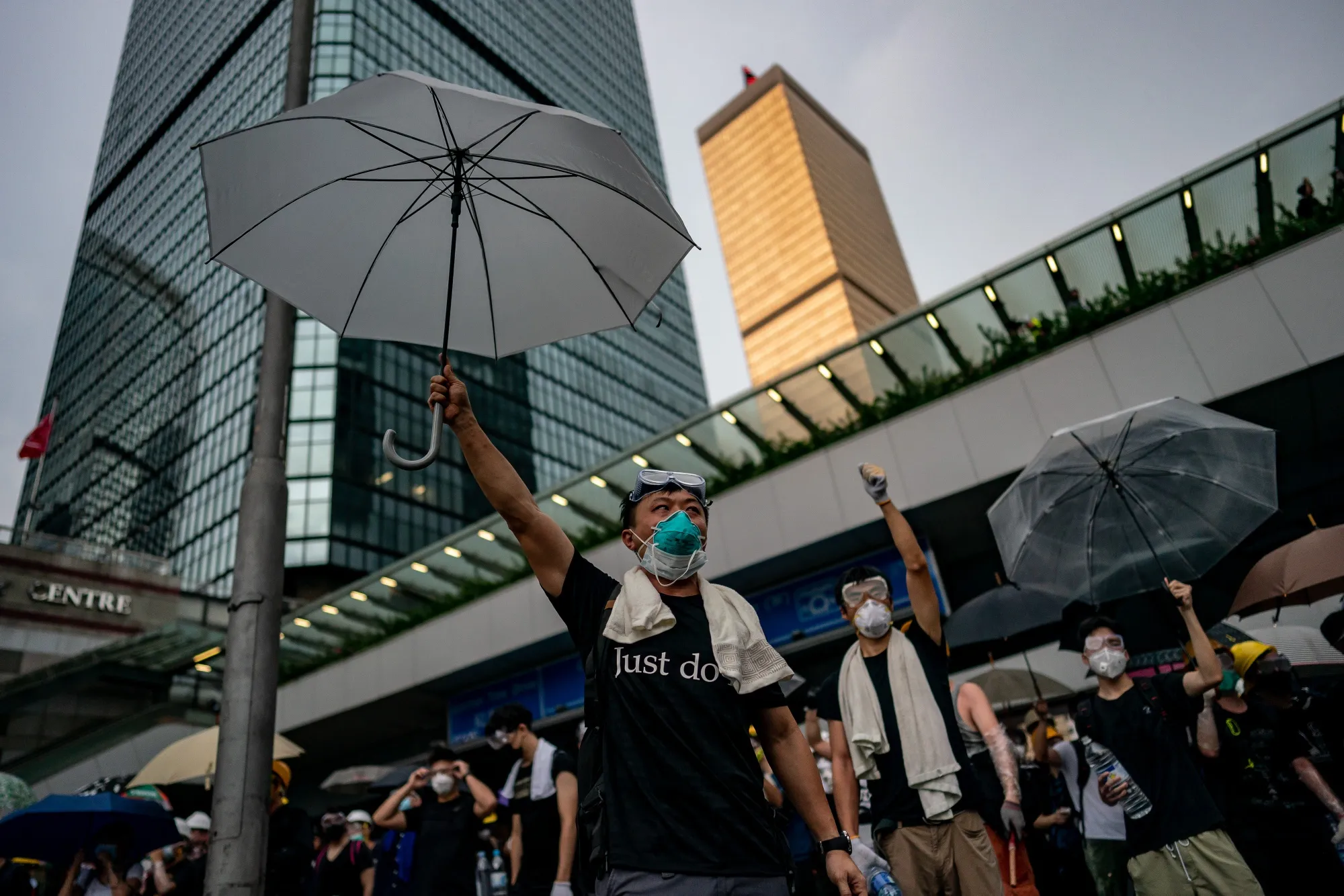 香港,香港 - 6 月 12 日:抗议者在 2019 年 6 月 12 日的抗议活动中举着雨伞。大批抗议者聚集在香港市中心,准备进行另一场大规模集会,以展示对政府的力量,反对一项允许引渡到中国的有争议计划。(照片由 Anthony Kwan/Getty Images 提供)摄影师:Anthony Kwan/Getty Images AsiaPac### 香港陷入混乱