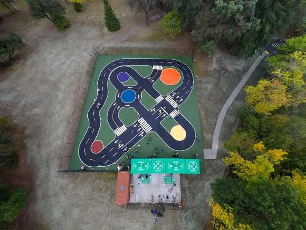 Alta Planning + Design在华盛顿州白中心的交通花园,重新利用了一个废弃的网球场,展示了多种道路场景。金县公园“当天第一次骑自行车的孩子们知道该在哪里、该做什么以及在哪里停下,”他说。在其他情况下,他指出,“骑行教练必须将网球拍切成两半并拿出锥形物……然后说,‘好吧,孩子们,这就是一个街道系统。’而孩子们则说,‘不,这只是一个有几个网球的停车场。’而在交通花园中,电路的设置方式显而易见,它就是为此而设。”