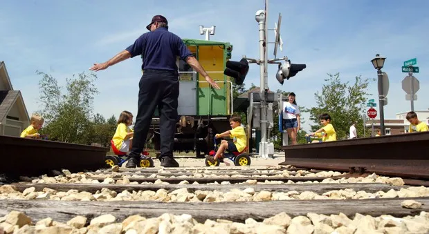 罗伯特·P·迈耶(Robert P. Meyer)来自芝加哥的联邦铁路管理局,在2002年访问伊利诺伊州纳珀维尔安全镇时,指导儿童通过铁路平交道。蒂姆·博伊尔(Tim Boyle)/盖蒂图片社对于前来查塔夸村学习骑自行车的三到五年级学生,课程从室内开始,学生们复习交通规则——例如在铁路轨道或停车标志前该怎么做。每位学生都会获得一个自行车头盔,并学习如何正确佩戴。