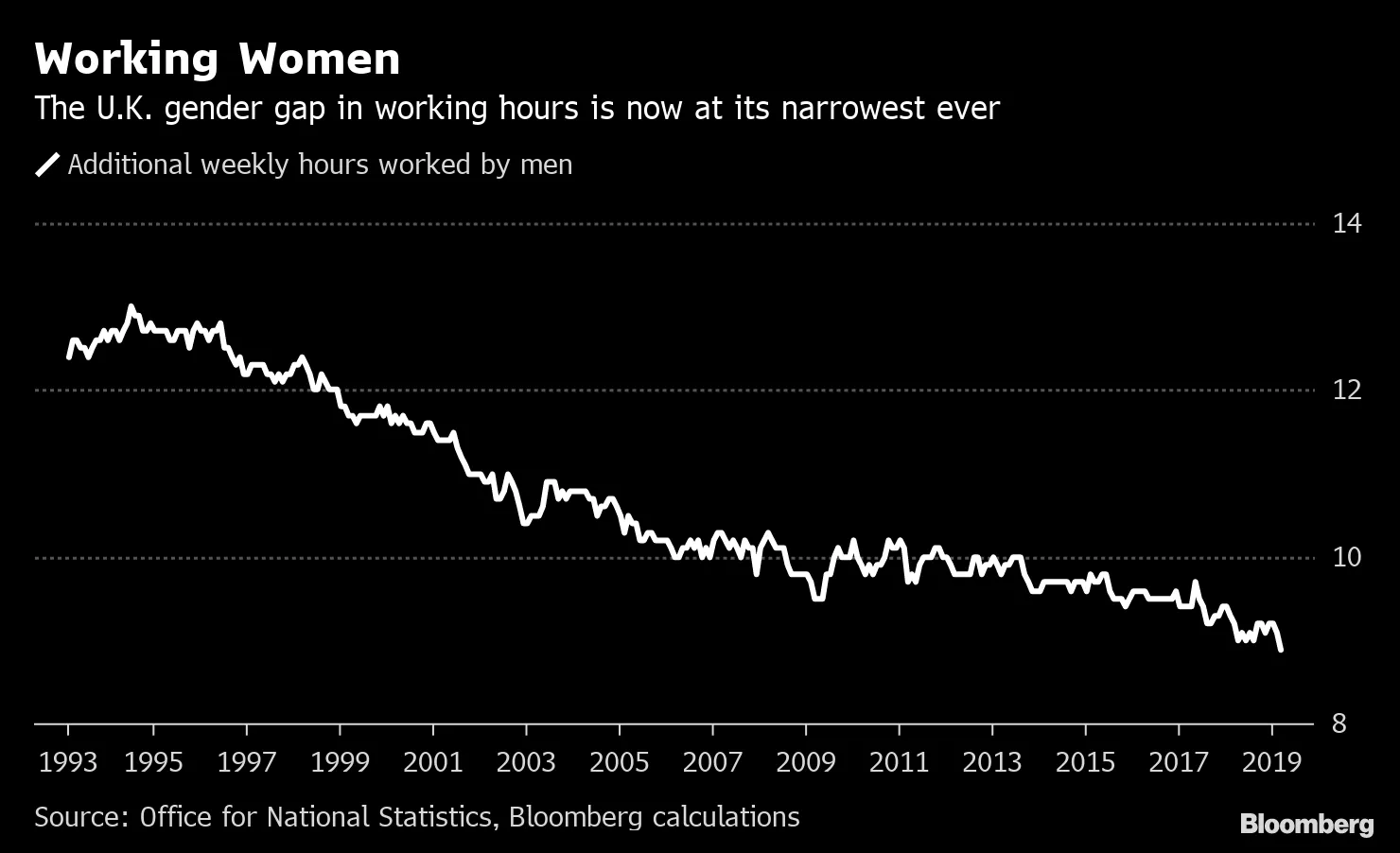 在英国的强制性性别薪酬报告实施两年后,至少有一个劳动力差距正在缩小:工作时长。平均而言,女性的工作时长是男性的四分之三,这是有史以来最小的差距。