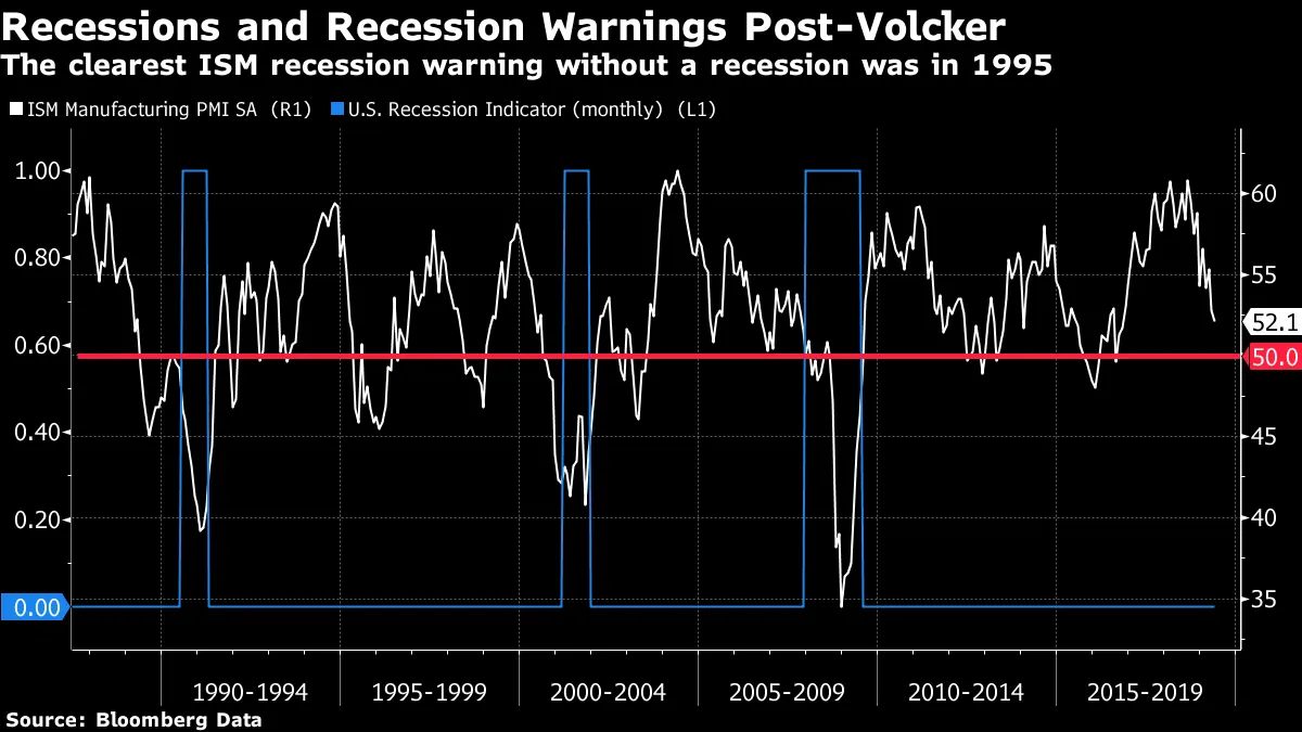 假设债券市场并没有定价即将到来的股市崩盘,这迫使美联储大幅降息。它似乎在期待类似于1995年的降息,当时经济确实看起来摇摇欲坠,濒临衰退。在后沃尔克时代,这是ISM制造业调查低于50(被视为收缩的指标)而经济随后没有陷入衰退的最长时期: