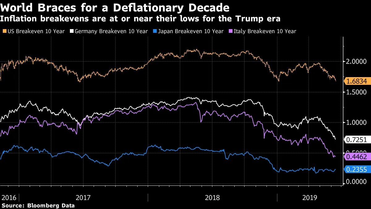一种观点是,如果贸易冲突加剧,美联储可以使用“保险性降息”来平息局势。债券市场显然预期利率会降低。最新的经济数据令人失望,特别是在美国就业方面,但这些数据通常噪音很大。市场对美联储将大幅降息的新信心最可能的解释来自于通胀预期。在美国,10年的预期几乎达到了自特朗普当选以来希望重新经济增长以来的最低点。德国,尤其是意大利,已经跌入新低。即使在日本,经过多年的“安倍经济学”刺激,通胀预期也未能停止进一步下降,且基数已经很低: