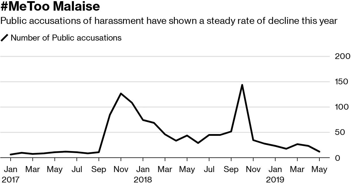 **性骚扰的急剧下降?**危机顾问发现,上个月对公众指控不当行为的媒体报道降至自2017年10月以来的最低水平,当时哈维·温斯坦的指控引发了#MeToo运动。