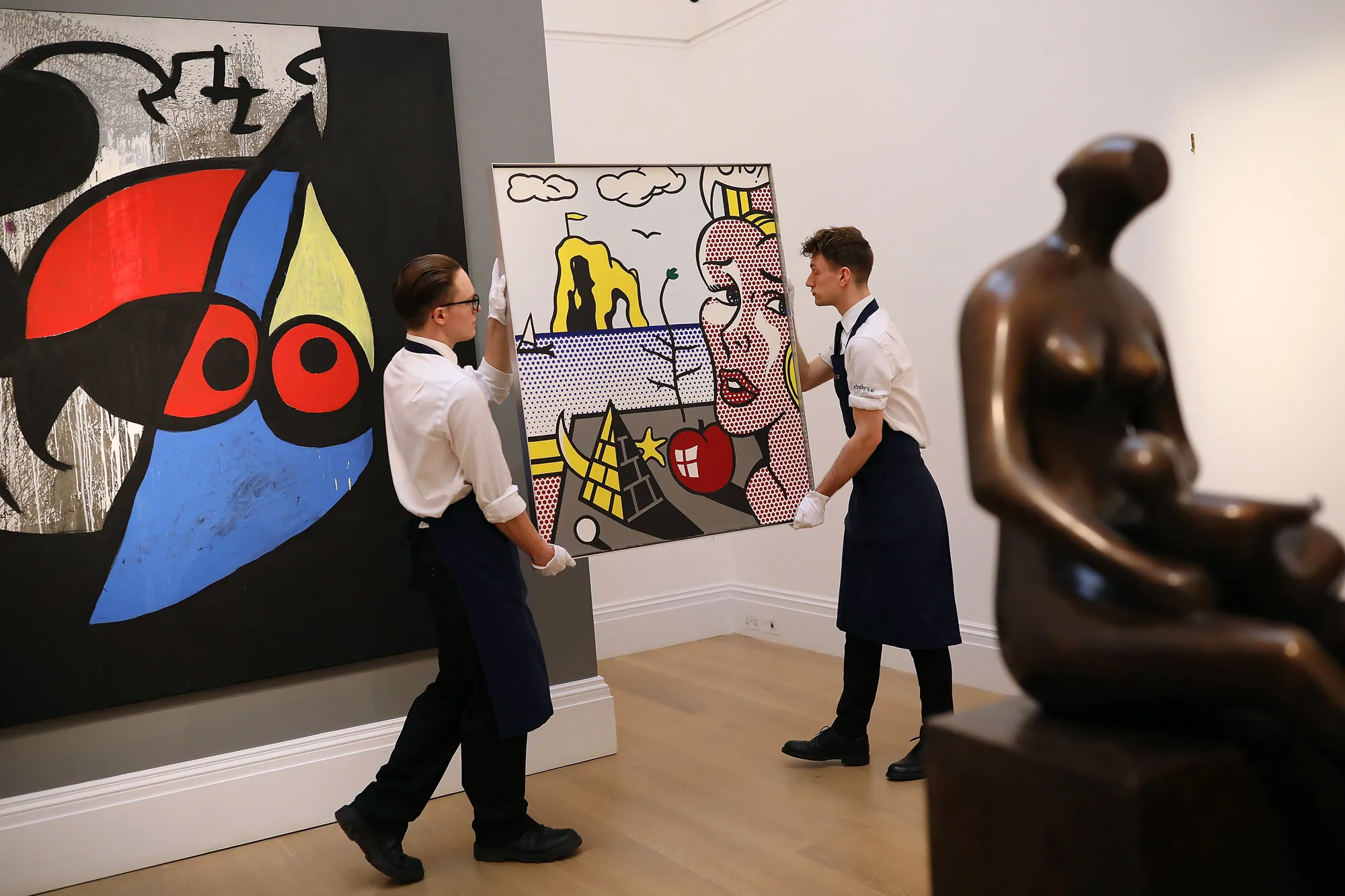 伦敦,英格兰 - 4月9日:苏富比的员工与罗伊·利希滕斯坦于1976年创作的名为《静物与头部》的画作合影,该画作在2018年4月9日于伦敦的“印象派与现代艺术”拍卖会的英国预展中展示。预计该作品在2018年5月14日于纽约苏富比拍卖行拍卖时将拍出700万至1000万美元。(照片由丹·基特伍德/盖蒂图片社提供)摄影师:丹·基特伍德/盖蒂图片社欧洲喜欢彭博社的晚间简报吗? 订阅Bloomberg.com。您将获得我们无与伦比的全球新闻报道和两份优质每日通讯,《彭博开盘》和《彭博收盘》,还有更多更多内容。请查看我们的限时优惠。